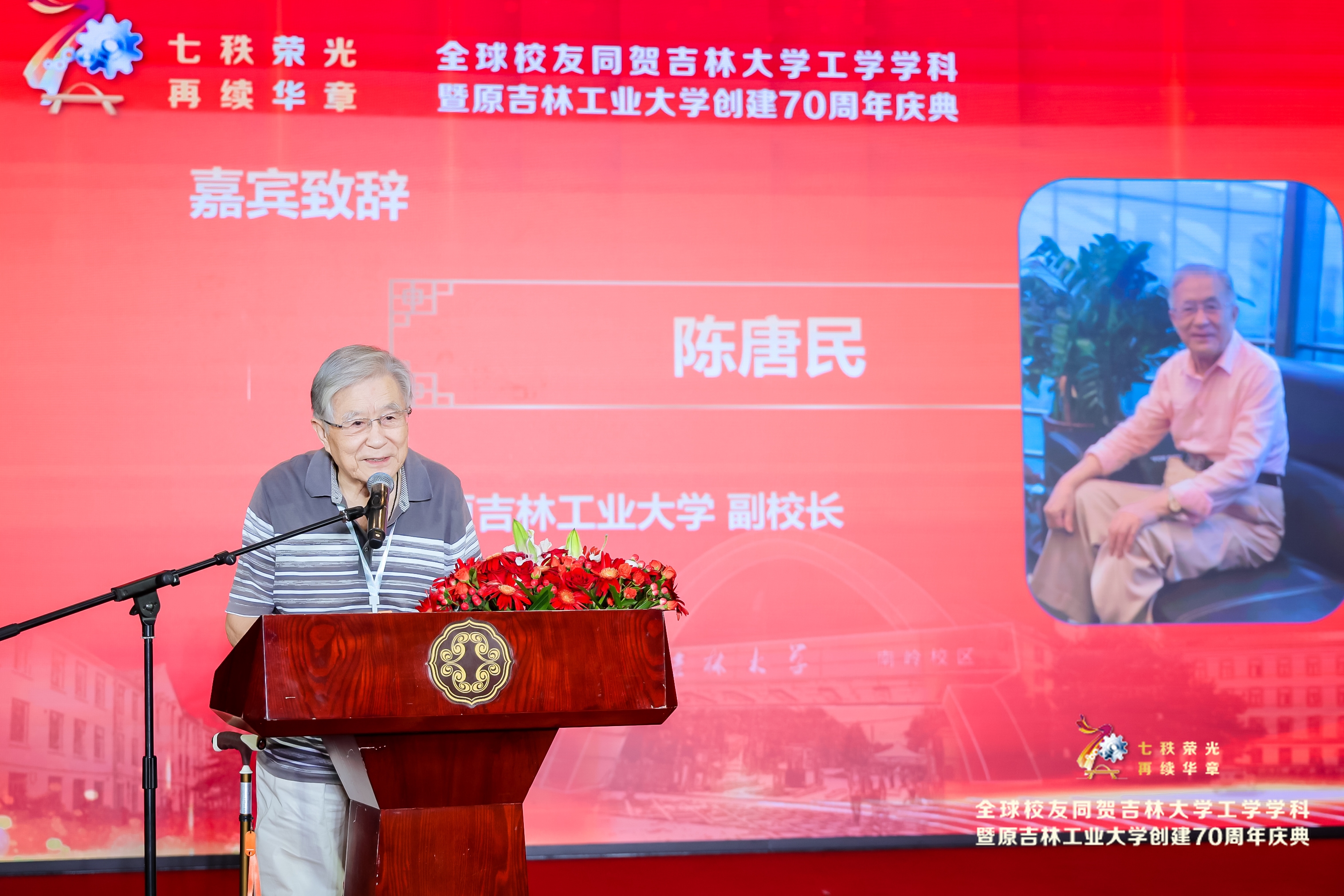 93岁的老校长陈唐民作为原吉林工大校领导代表发言,他深情回望学校初创岁月,在一穷二白的艰难起步中,为新中国汽车、农机学科的发展与人才培养筑牢根基,寄语年轻校友勇闯创新之路、续写学科荣光,引发全场校友的强烈共鸣。